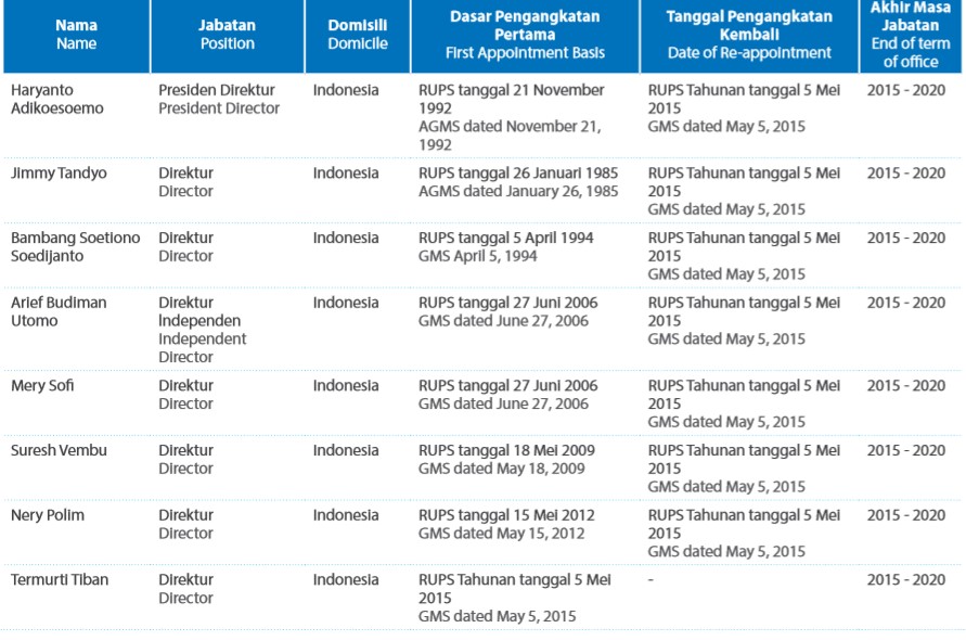 For the appointment of the Directors, the Board of Directors candidates can be nominated by the controlling shareholder. The Nomination and Remuneration Committee will then discuss the profile and qualifications of each candidate in the nomination meetings. Selected candidates will then be appointed with the approval of the General Meeting of Shareholders. In order to meet the needs of the Company, the Directors are appointed based on their qualifications according to the requirements set by the Otoritas Jasa Keuangan, as stipulated in their Regulation No. 33/POJK.04/2014 concerning the Board of Directors and Board of Commissioners of Public Companies, that included:
