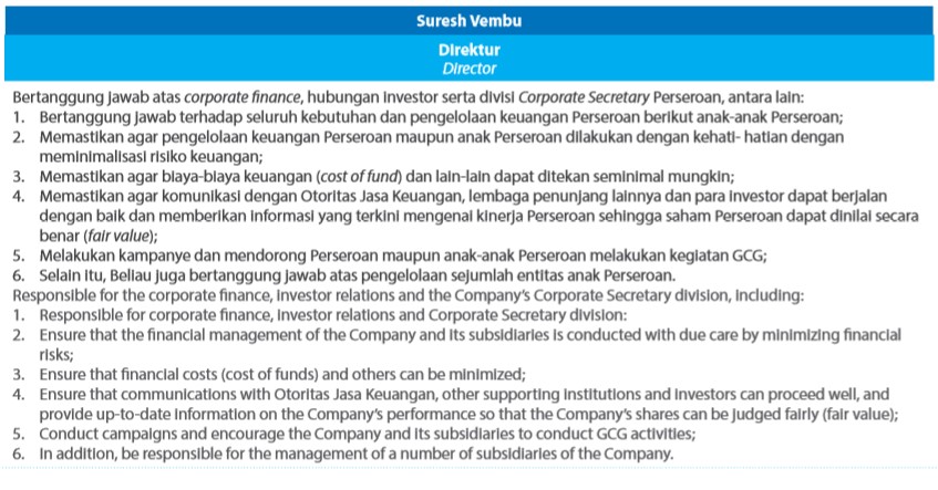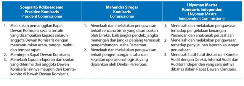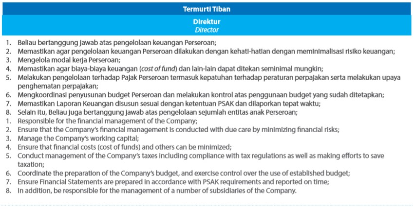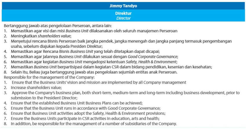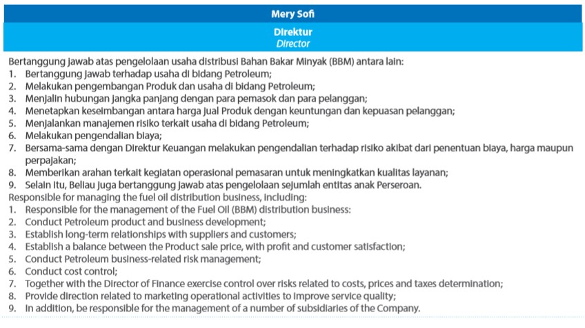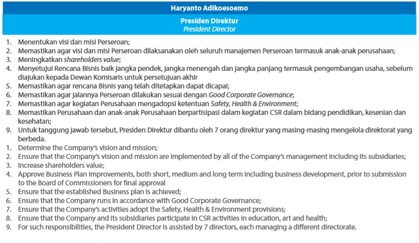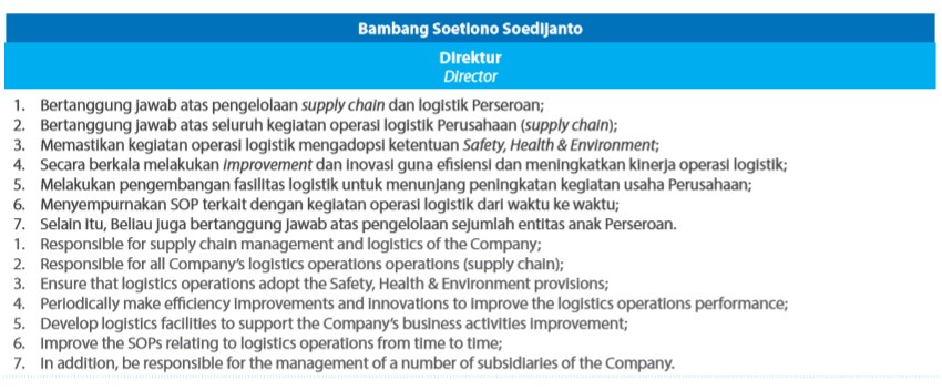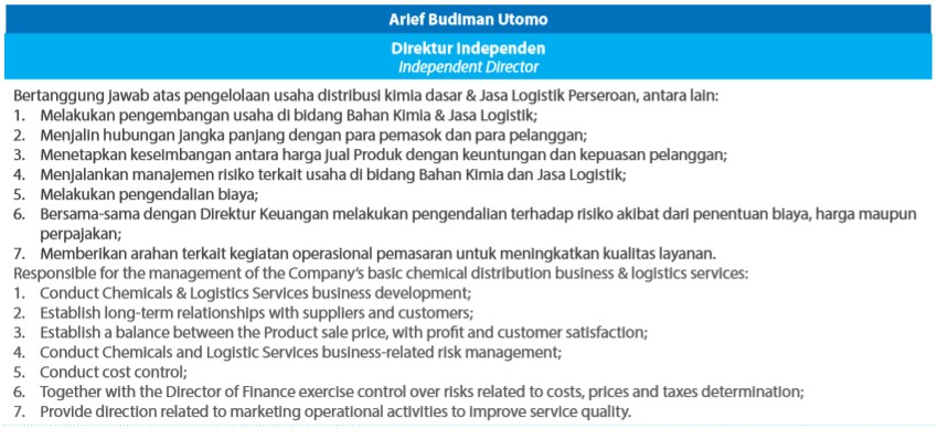 2. Each member of the Board of Directors is also obliged to use all their abilities to achieve the Company’s vision of becoming a major player in as a provider of logistics services, and procurement solutions for chemical and energy products in Indonesia. The Board of Directors Members are also obliged use all their abilities to achieve the Company’s mission of optimizing its potential to continuously increase its value for shareholders and related parties.