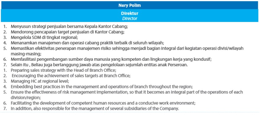 2. Those appointed as members of the Board of Directors can be Indonesian citizens and / or foreign nationals who are qualified to be appointed as Directors of the Company under the Otoritas Jasa Keuangan regulations provisions and other laws and regulations.
